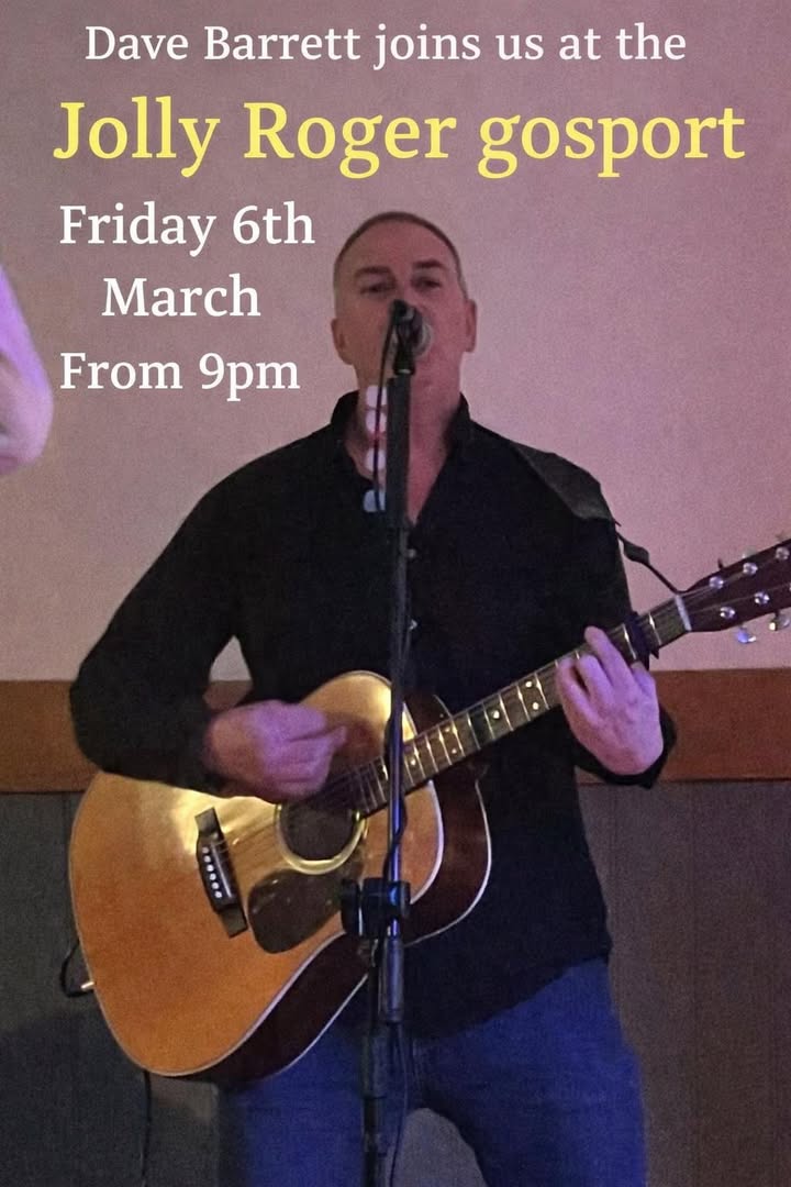 🎶 Live Music This Friday! 🎶 Join us at The Jolly Roger, Gosport this Friday 6th March as Dave Barrett takes to the stage from 9pm 🎤 Great vibes, great drinks, and a brilliant night guaranteed 🍻 See you at the Jolly!